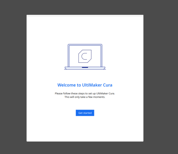 Once Ultimaker Cura is up and running you will be presented with this popup welcome box. All our first-time setup will be done in this window, click Get Started to continue.