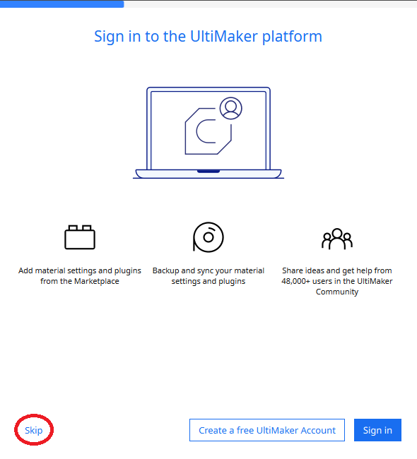 Continue until you are invited to make an ultimaker account. On the bottom left of the window there is an option to skip, click on this.