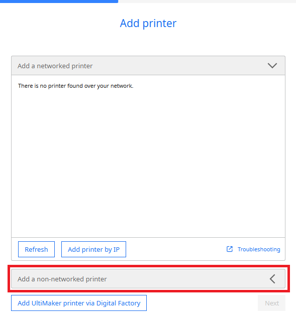 You will then be shown the following screen. Click on "Add a non-networked printer" which will open up a dropdown list of printers.