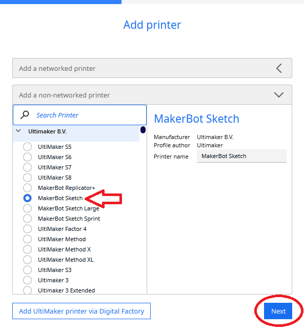 We here at the libraries are using Makerbot Sketch printers. Select Makerbot Sketch from the list of options, then press next.
