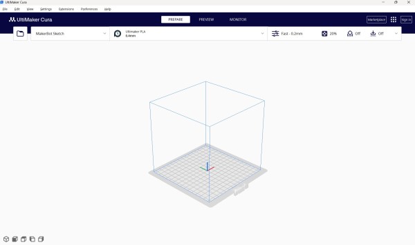Now that setup is complete, we can see that the slicer is ready for us to use. You can see that the MakerBot Sketch is selected and Ultimaker PLA is the material in use - this is ideal!